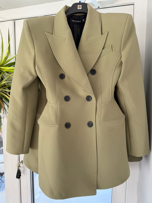 Stilīga un sievišķīga mini kleita ar strukturētiem pleciem un akcentētu vidukli. Divrindu pogas piešķir klasisku eleganci, bet pieguļošais siluets izceļ augumu. Ideāla svētkiem, vakaram vai modernam biroja tēlam.