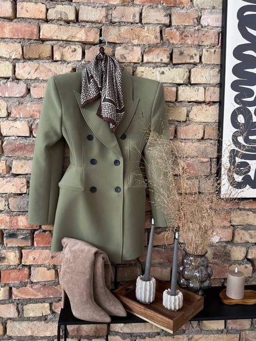 Eleganta žaketes tipa kleita olīvzaļā tonī.